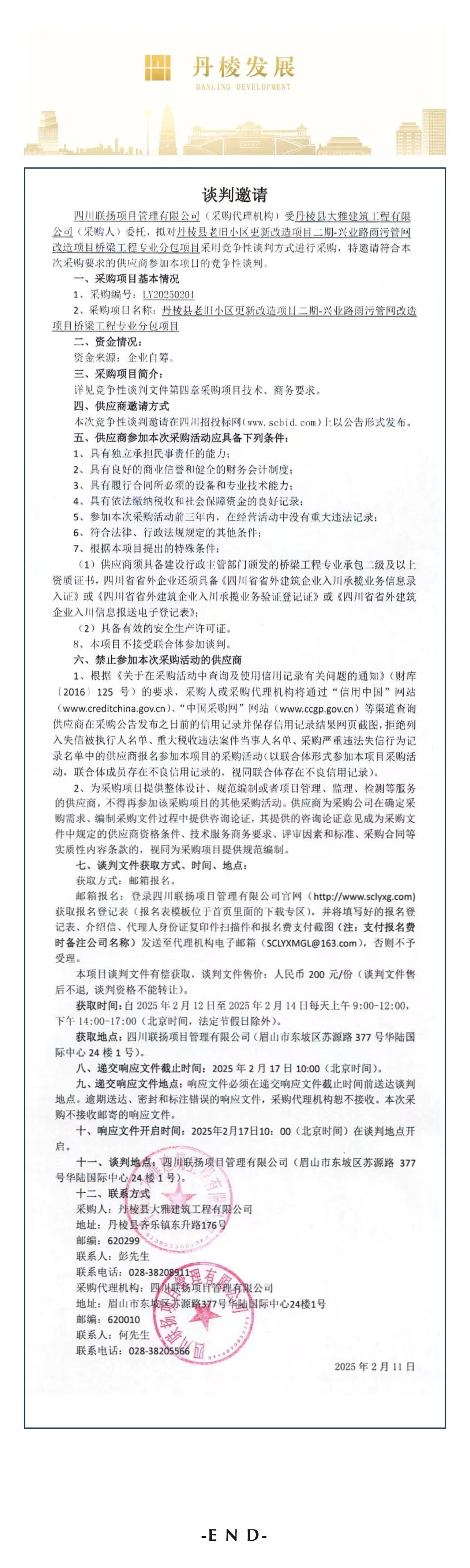 丹棱縣老舊小區(qū)更新改造項(xiàng)目二期-興業(yè)路雨污管網(wǎng)改造項(xiàng)目橋梁工程專業(yè)分包項(xiàng)目談判邀請(qǐng)公告