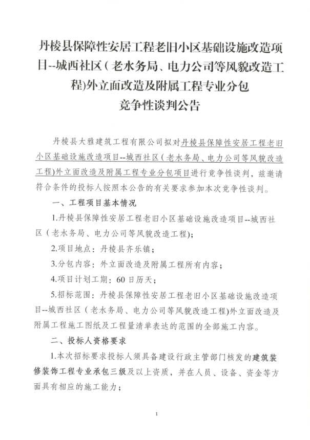 【大雅建筑公司】丹棱縣保障性安居工程老舊小區(qū)基礎(chǔ)設(shè)施改造項目--城西社區(qū)(老水務(wù)局、電力公司等風(fēng)貌改造工程)外立面改造及附屬工程專業(yè)分包競爭性談判公告