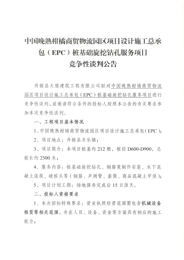 【大雅建筑公司】中國晚熟柑橘商貿(mào)物流園區(qū)項(xiàng)目設(shè)計(jì)施工總承包(EPC)樁基礎(chǔ)旋挖鉆孔服務(wù)項(xiàng)目競爭性談判公告