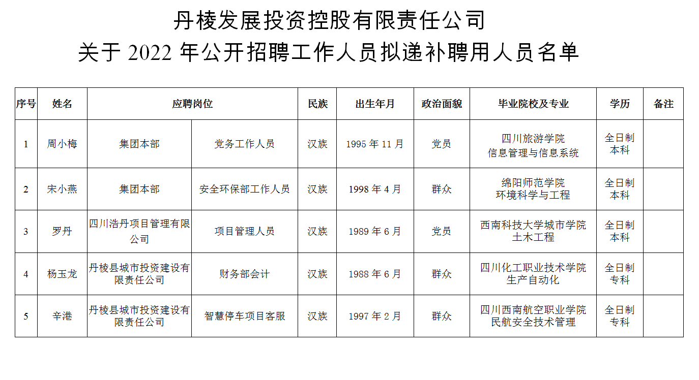 附件:丹棱發(fā)展投資控股有限責(zé)任公司關(guān)于2022年公開招聘工作人員擬遞補聘用人員名單