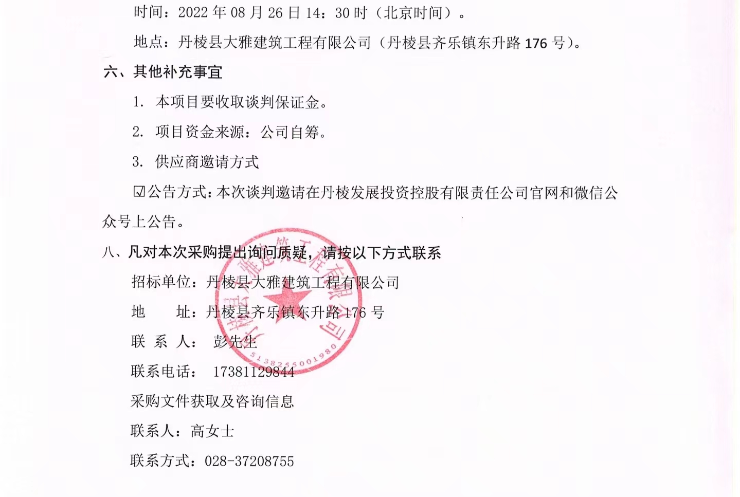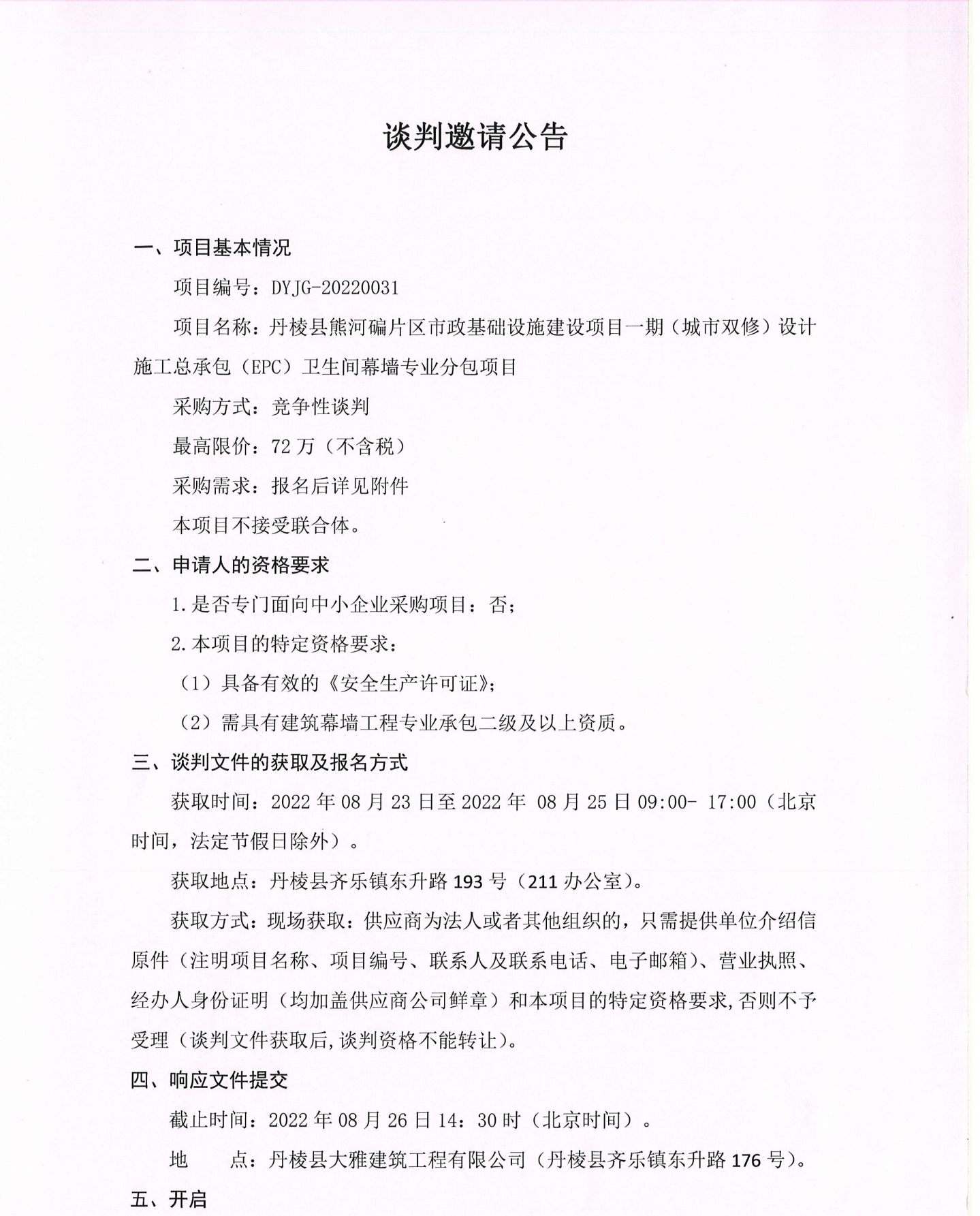 丹棱縣熊河碥片區(qū)市政基礎(chǔ)設(shè)施建設(shè)項(xiàng)目一期(城市雙修)設(shè)計(jì)施工總承包(EPC)衛(wèi)生間幕墻專(zhuān)業(yè)分包項(xiàng)目談判邀請(qǐng)公告