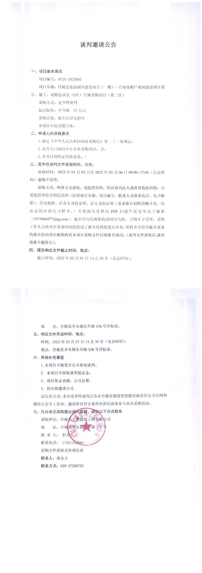 丹棱縣食品園區(qū)建設項目(一期)--丹棱凍粑產業(yè)園建設項目設計、施工、采購總承包(EPC)空調采購項目(第二次)談判邀請公告
