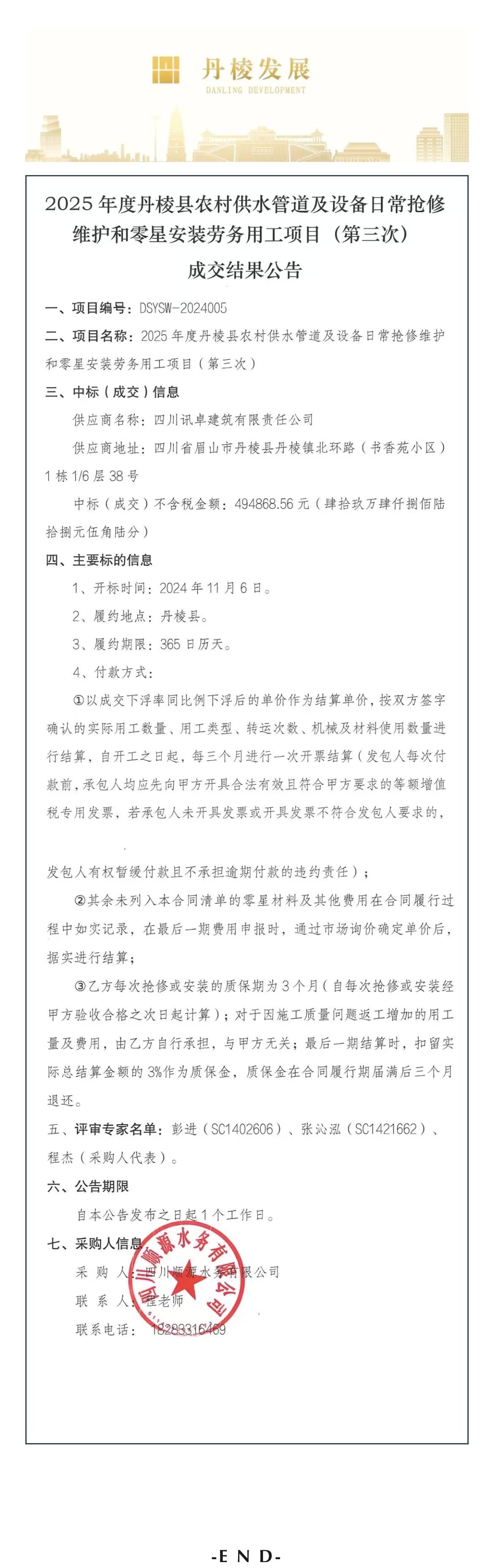 2025年度丹棱縣農(nóng)村供水管道及設(shè)備日常搶修維護和零星安裝勞務(wù)用工項目(第三次)成交結(jié)果公告