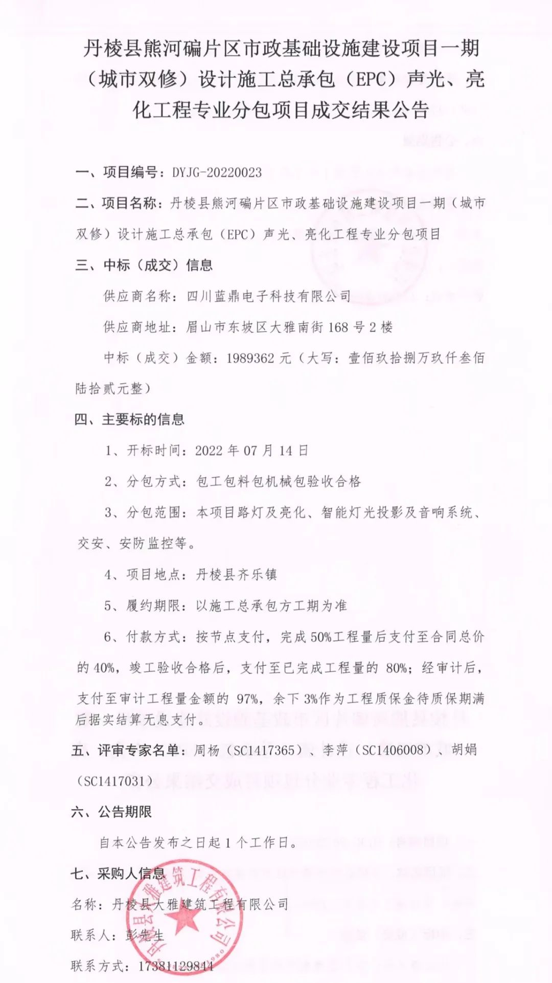 丹棱縣熊河碥片區(qū)市政基礎(chǔ)設(shè)施建設(shè)項(xiàng)目一期(城市雙修)設(shè)計(jì)施工總承包(EPC)聲光、亮化工程專業(yè)分包項(xiàng)目成交結(jié)果公告