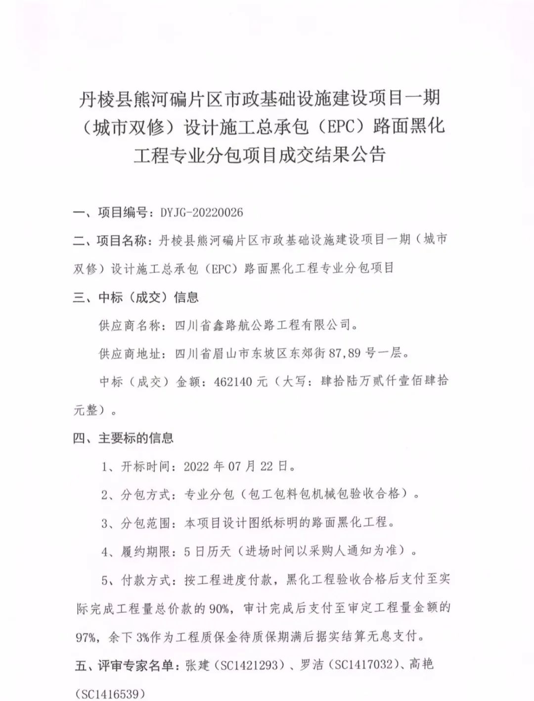 丹棱縣熊河碥片區(qū)市政基礎(chǔ)設(shè)施建設(shè)項目一期(城市雙修)設(shè)計施工總承包(EPC)路面黑化工程專業(yè)分包項目成交結(jié)果公告