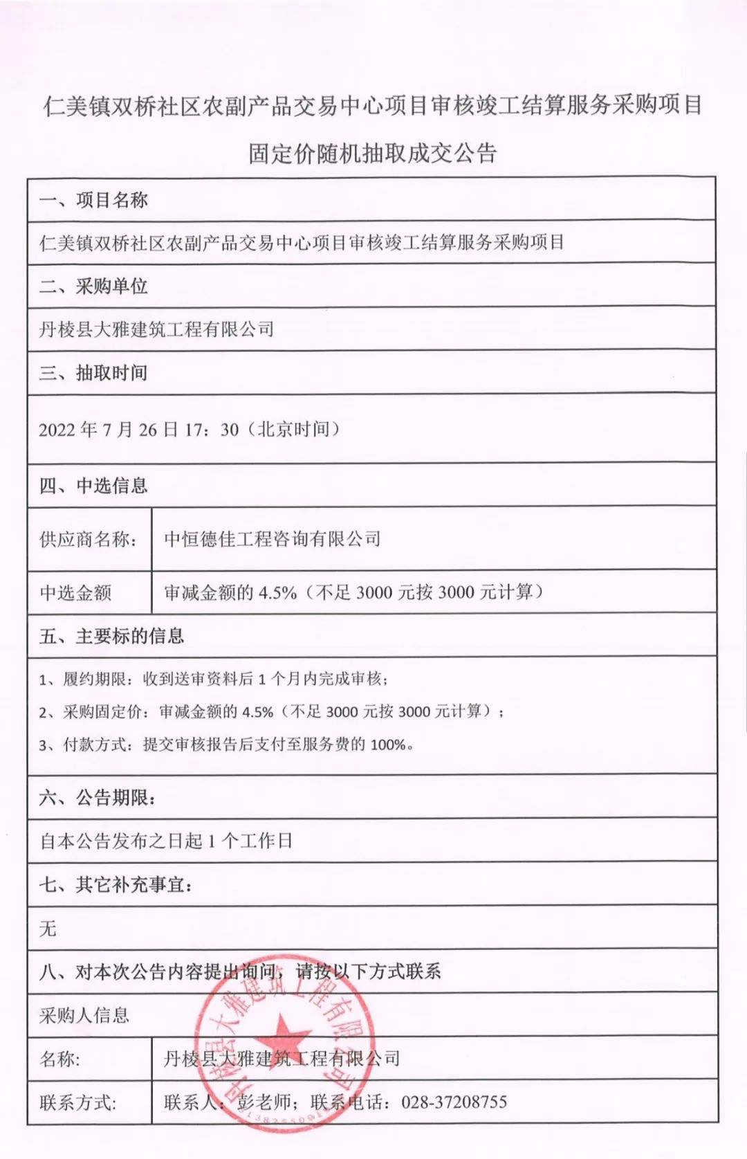 仁美鎮(zhèn)雙橋社區(qū)農(nóng)副產(chǎn)品交易中心項目審核竣工結(jié)算服務(wù)采購項目固定價隨機(jī)抽取成交公告