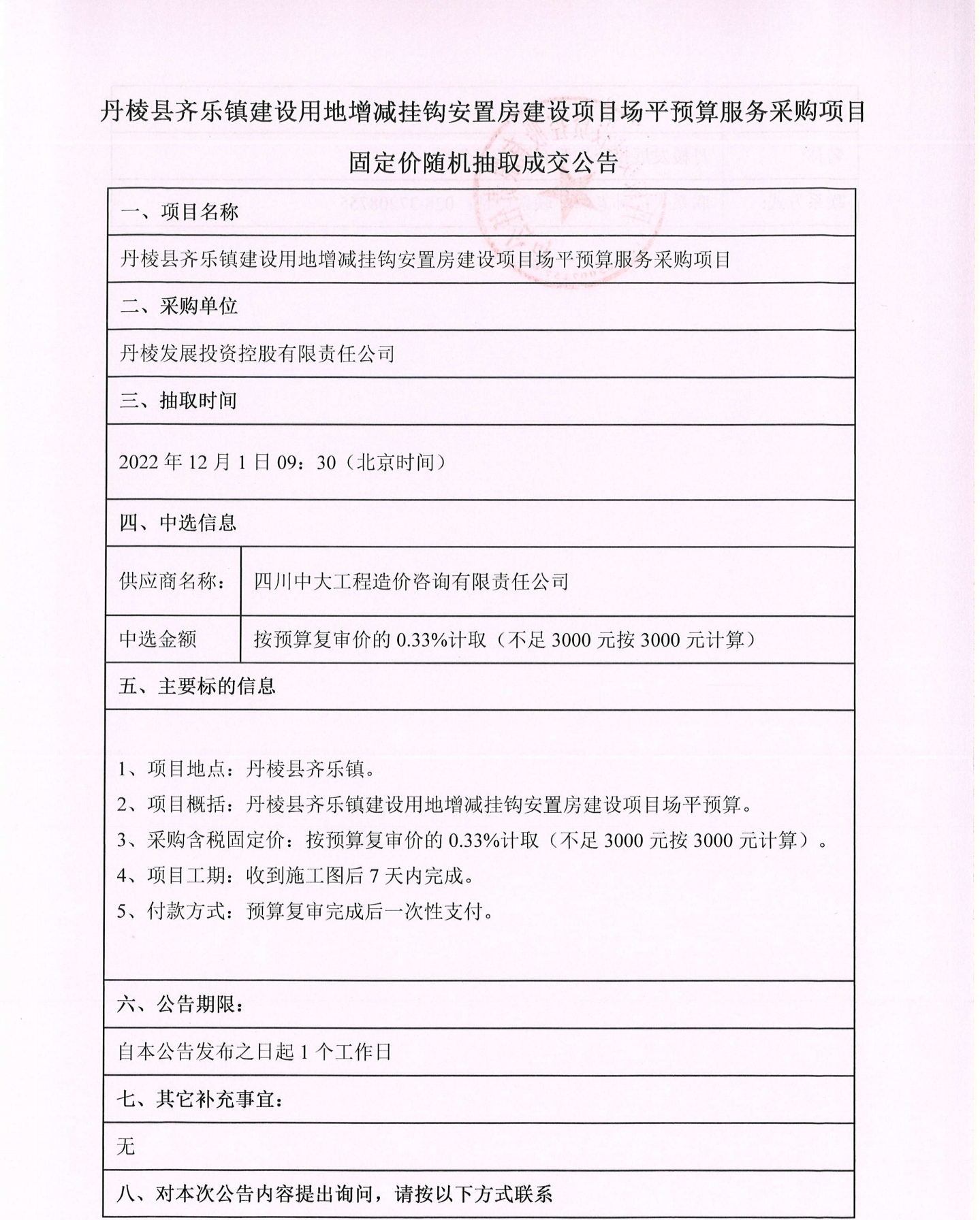 丹棱縣齊樂鎮(zhèn)建設(shè)用地增減掛鉤安置房建設(shè)項(xiàng)目場平預(yù)算服務(wù)采購項(xiàng)目固定價(jià)隨機(jī)抽取成交公告
