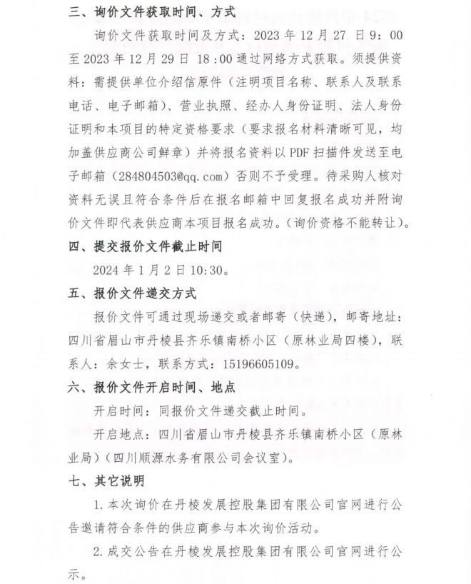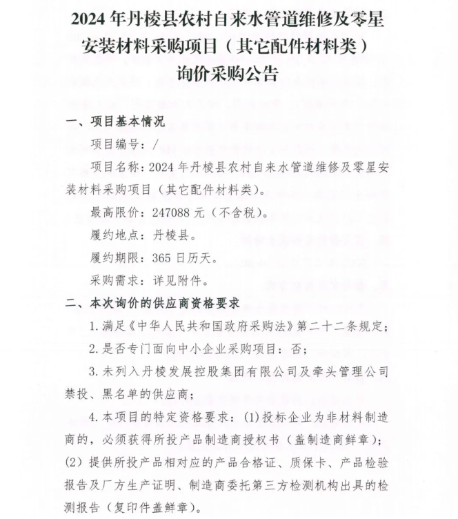 2024年丹棱縣農(nóng)村自來(lái)水管道維修及零星安裝材料采購(gòu)項(xiàng)目 (其它配件材料類 )詢價(jià)采購(gòu)公告