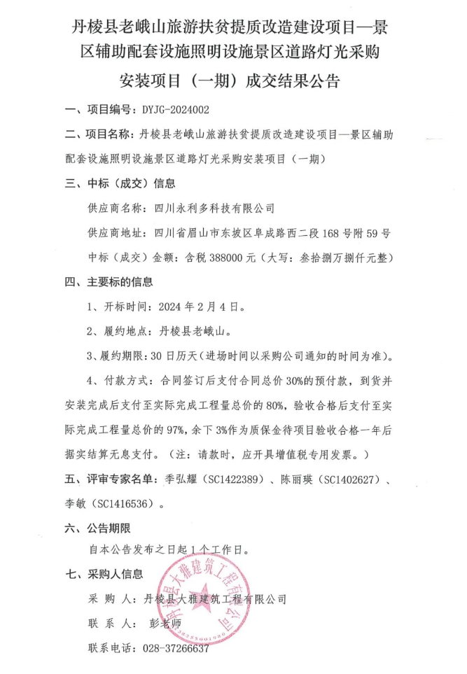 丹棱縣老峨山旅游扶貧提質(zhì)改造建設(shè)項(xiàng)目—景區(qū)輔助配套設(shè)施照明設(shè)施景區(qū)道路燈光采購安裝項(xiàng)目(一期)成交結(jié)果公告