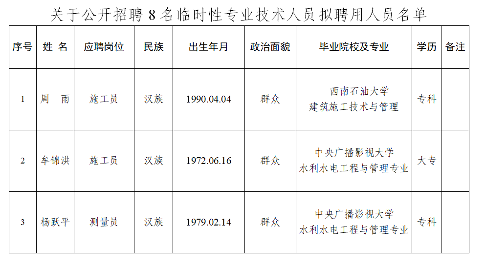 根據(jù)《丹棱縣大雅建筑工程有限公司關于公開招聘8名臨時性專業(yè)技術人員的公告》(以下簡稱《公告》)有關規(guī)定,經(jīng)研究決定,現(xiàn)將擬聘用人員予以公示,公示期限為3個工作日,從公示之日起計算。